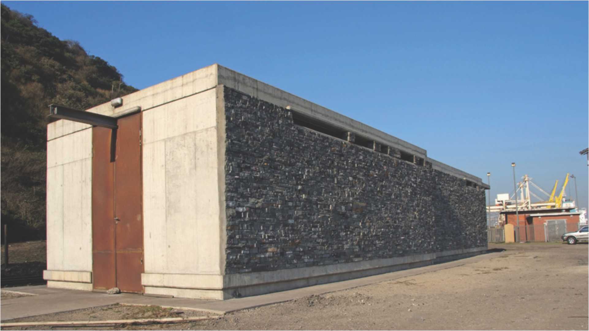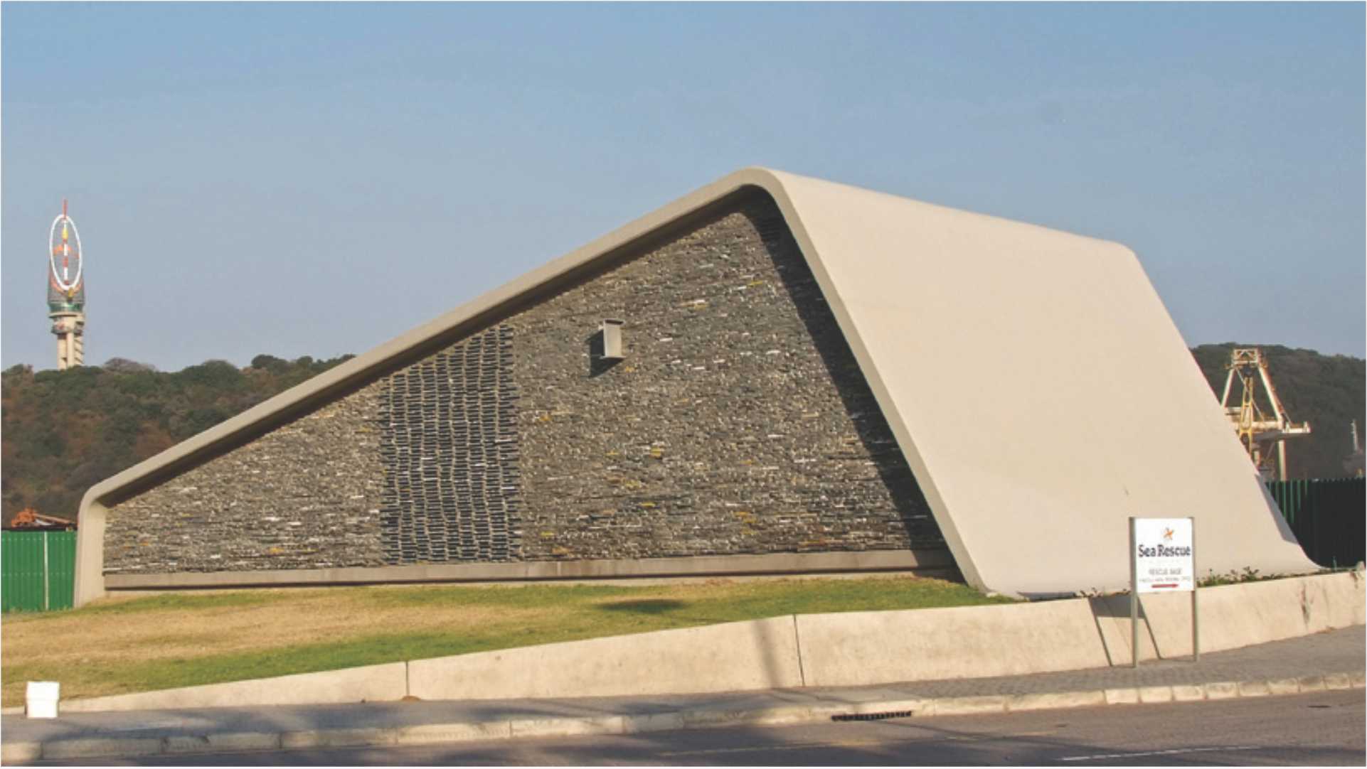 The structure forms a seamless capsule allowing workers and vehicles 24-hour access within a safe environment to service the tunnel below. While responsive to the industrial harbour context, the sculptural plastic roof form serves as a recognisable landmark along Mahatma Ghandi Road. All stone has been reconstituted from waste collected from various local stonemasons. The stone matches that of the local grey dolerite, which served historically as a significant building material to the Durban Harbour walls.