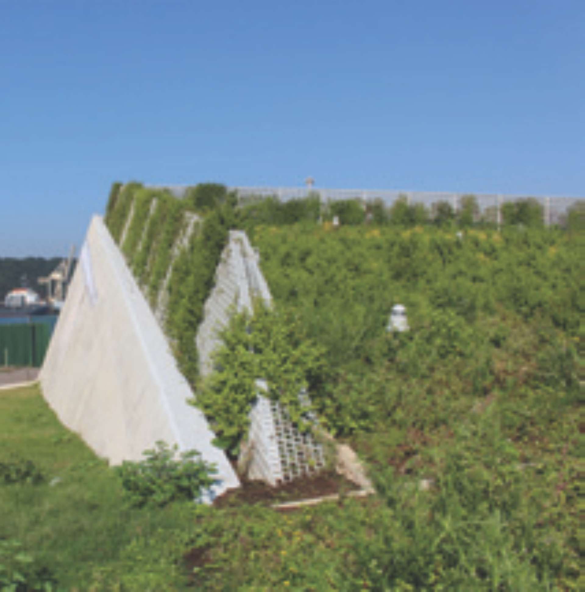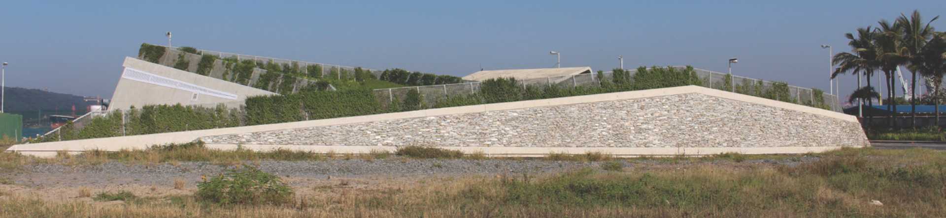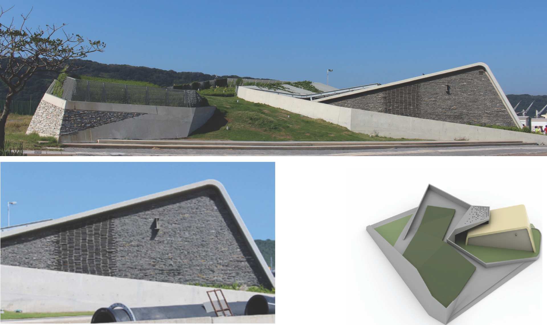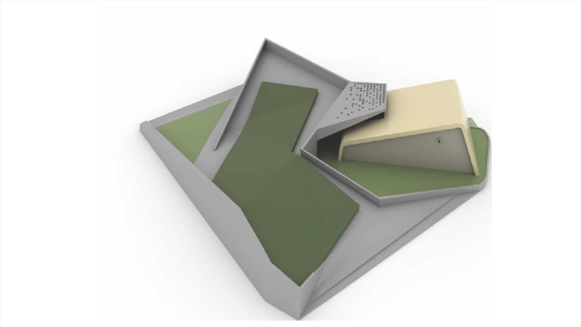 The sewer top structure forms the latest intervention in the harbour service tunnel complex Side walls and roof plane collide to create a dynamic form. These shifting plates have been landscaped and shaped to allow for public access. The surface structure becomes a landscape public space (sand dune) with sewerage pump facility below.