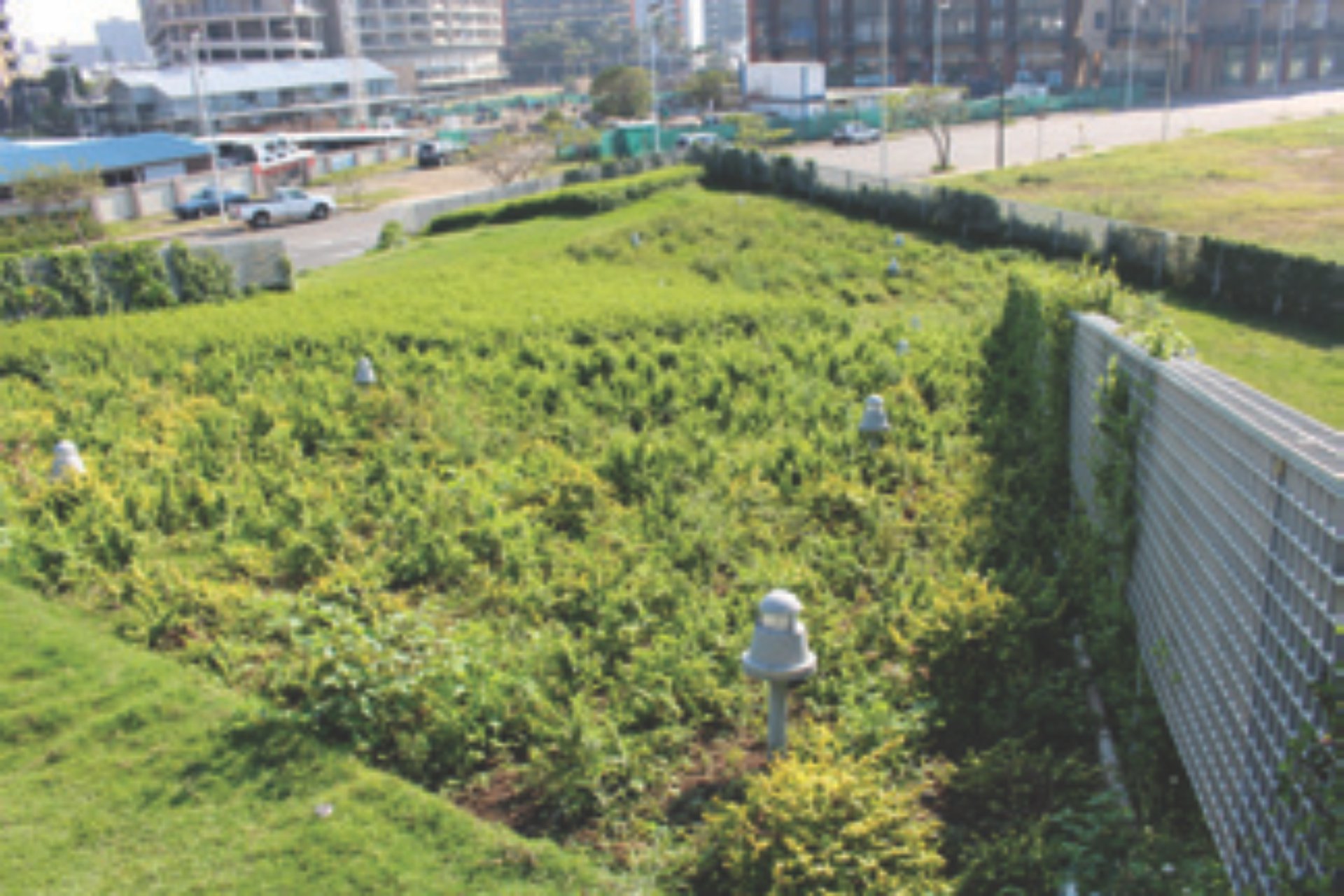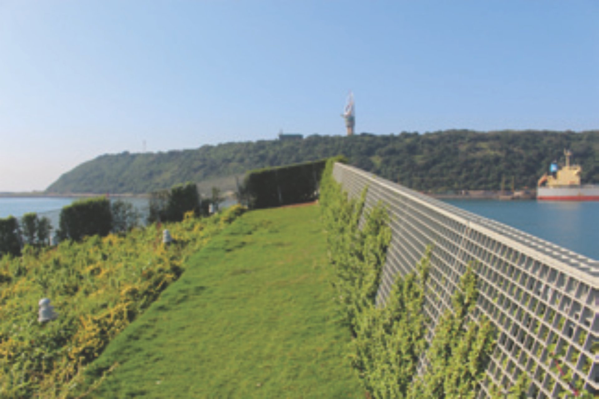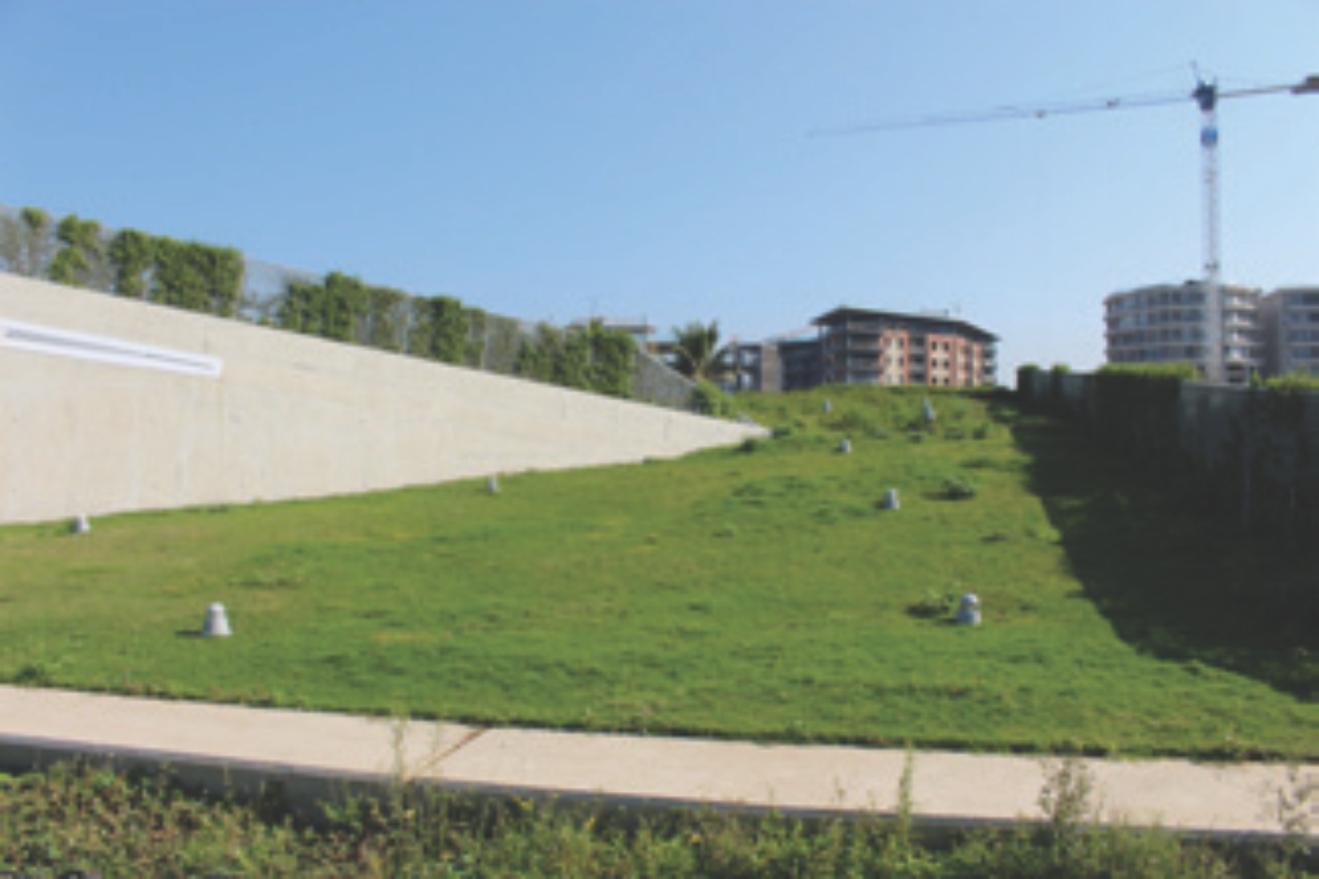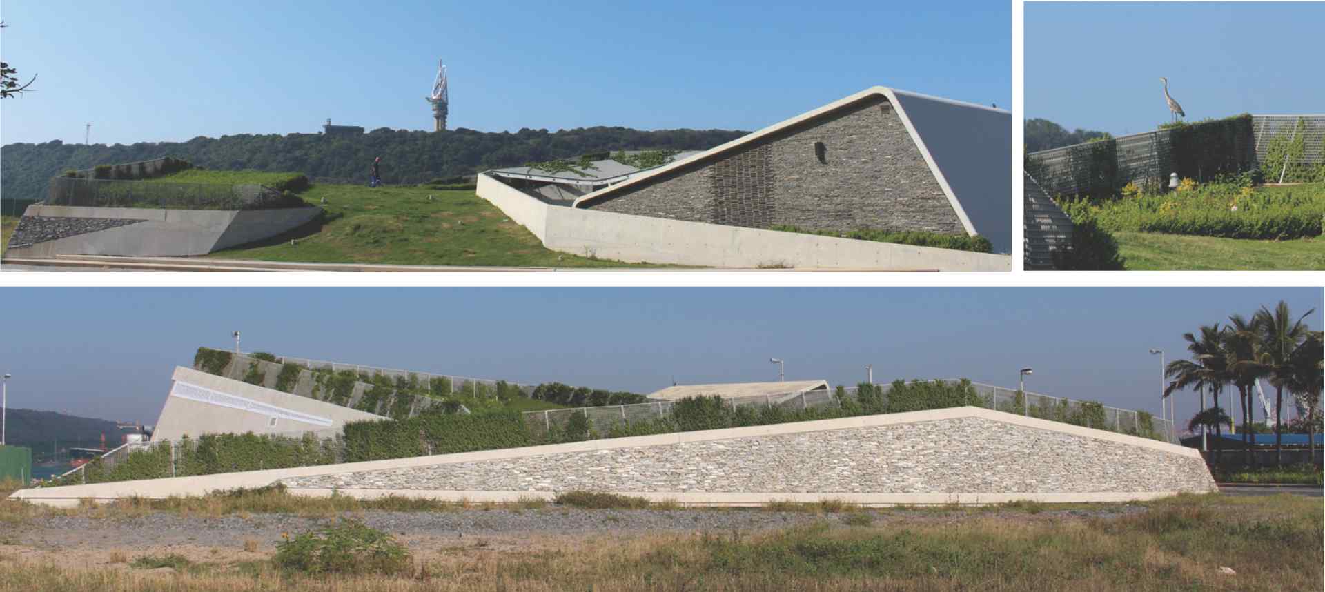 The sewer top structure forms the latest intervention in the harbour service tunnel complex Side walls and roof plane collide to create a dynamic form. These shifting plates have been landscaped and shaped to allow for public access. The surface structure becomes a landscape public space (sand dune) with sewerage pump facility below.