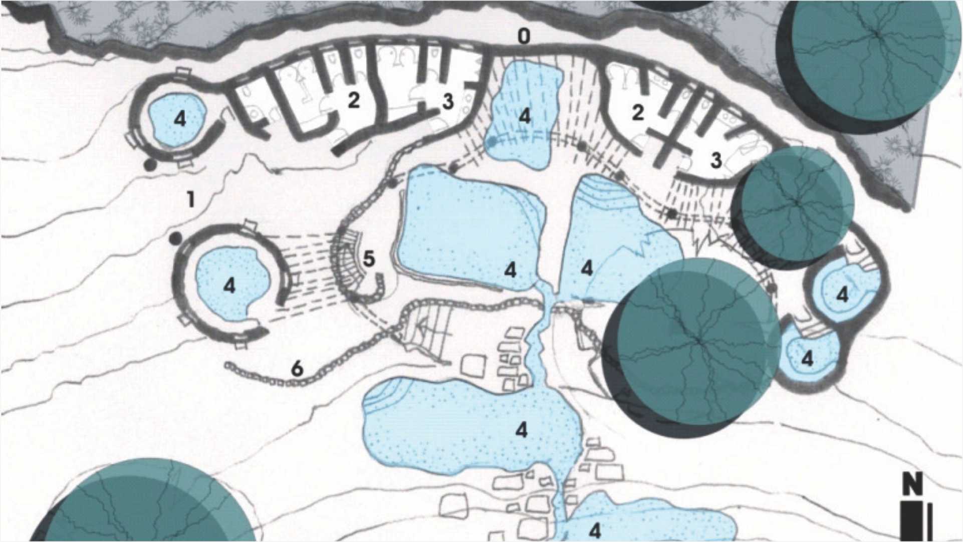 An assortment of communal hot mineral pools is sensitively sculpted into the landscape, discreetly carved into organic stone structures. The pools are supplemented by ablutions and change-room facilities. There is opportunity to re-program some enclosures for future use as massage therapy rooms or management offices. The architectural aesthetic facilitates a branding for tourism, drawing on Lilani’s unique natural character