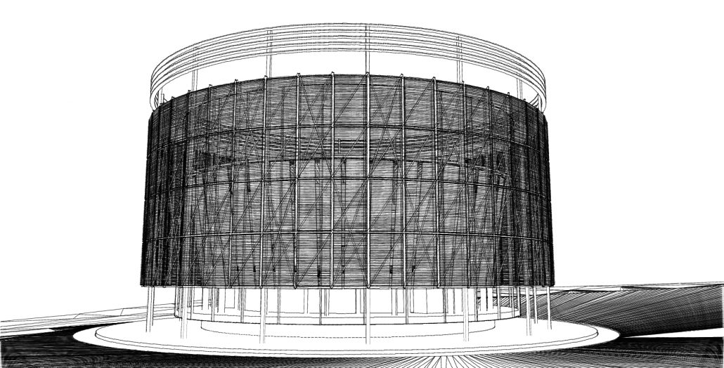 The building cuts a strong East/West axis through the site, punctuated by the chamber which acts as a pivotal point to the linear form.